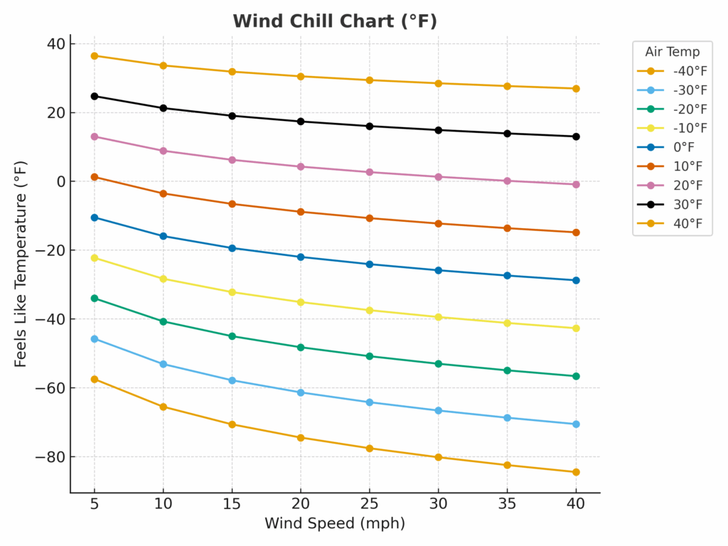 Move that up to 20 mph or 30 mph wind or strong and your gear will be tested to the limit. Here’s a wind chill chart graphic showing how wind speed and air temperature combine to make it feel much colder.