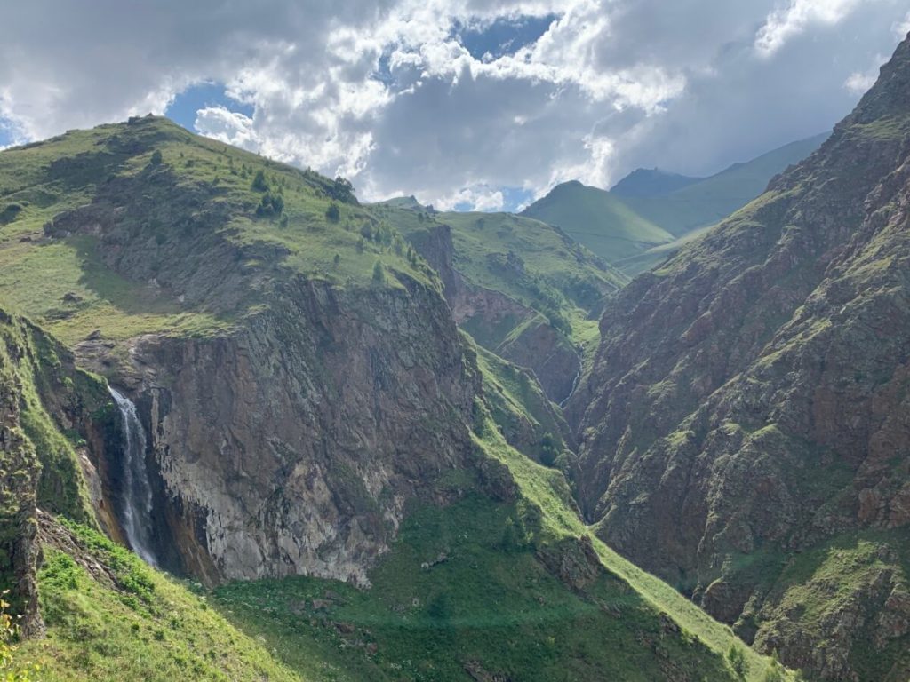 The drive is on winding roads through the mountains towards the north side of Mount Elbrus. As we get closer to Elbrus we have some close up views of the mountain before winding slow and steeply downhill towards the drop off point. If the weather is good, we will make a 3 hour hike walking past three waterfalls and stunning mountain scenery. The walk is a great way to start this trip with interesting cliff faces, stream, sulfur springs and beautiful landscape before walking into the Hathansu Meadow camp at 2,575m/ 8,448 feet. If raining, we will drive closer or even all the way into camp. Elevations gain 400m/ 1,312 feet.