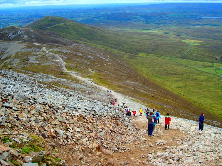 Terrain is mixed rock and dirt, slippy, steep and rocky. You need proper hiking boots, equipment and take your time on this long beautiful walk up Ireland’s holy mountain.