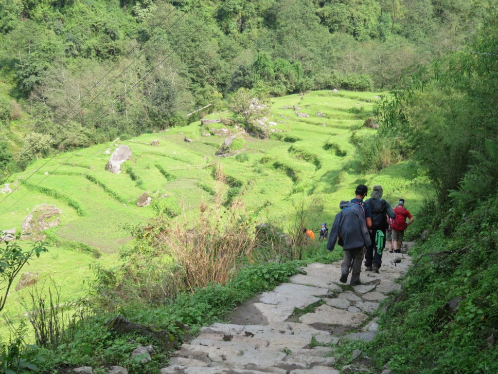 After a few days of recovery and relaxation in Kathmandu and Pokhara, it is now time to walk! You will be up early for breakfast and then drive to Nayapul which takes approximately 2+ hours. From there, you will get into a 4WD vehicle and 45 minutes later you will arrive near Tikhedhungga, at 1,577m/ 5,173 feet. Lunch will be served here and then you will start walking up hill on stairs for 2 hours or 2:30 minutes before reaching Ulleri 2,020m/ 6,627 feet. The total hike should take 2-3 hours. You hike down 20m/ 66 feet, and up 443m/ 1,443 feet all on stairs.